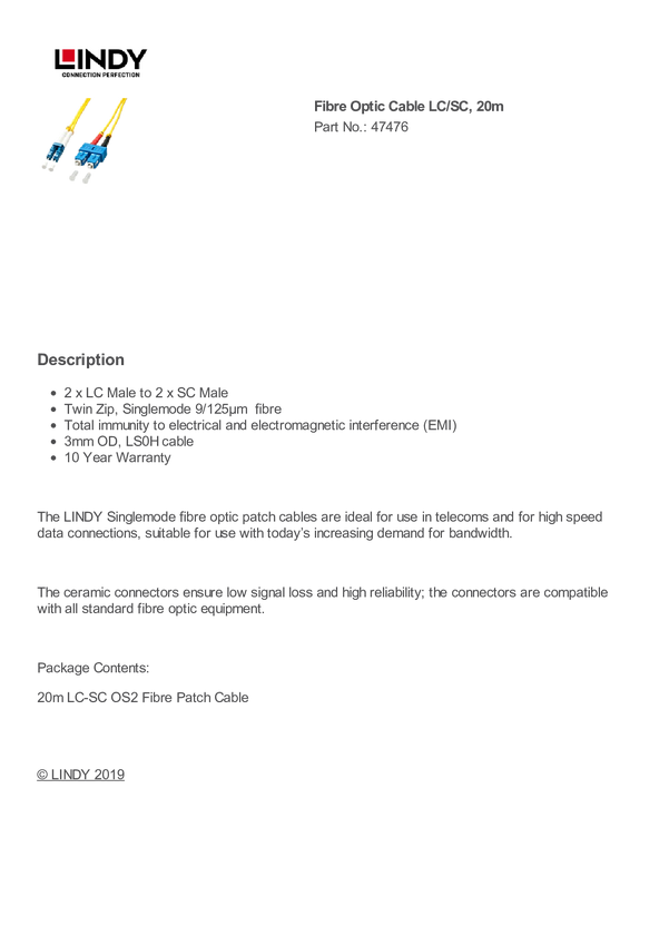 LINDY 47476 światłowodowe do światłowodów kabel 20.00 m Singlemode OS2