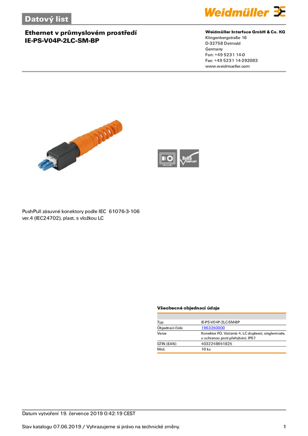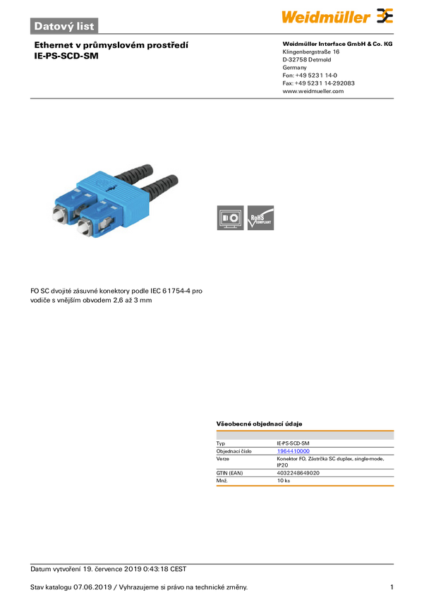 Złącze światłowodowe, wtyk SC-Duplex, Singlemode, IP 20 IE-PS-SCD-SM Weidmüller 1964410000