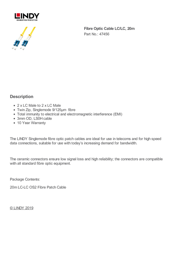 LINDY 47456 światłowodowe do światłowodów kabel 20.00 m Singlemode OS2