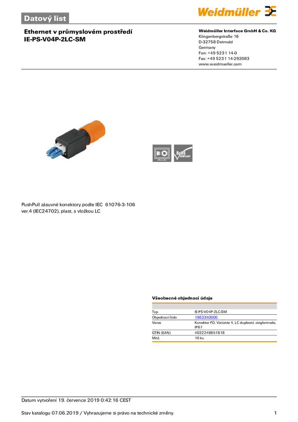 Złącze światłowodowe, wariant 4, LC-Duplex Singlemode, IP 67 IE-PS-V04P-2LC-SM Weidmüller 1963340000