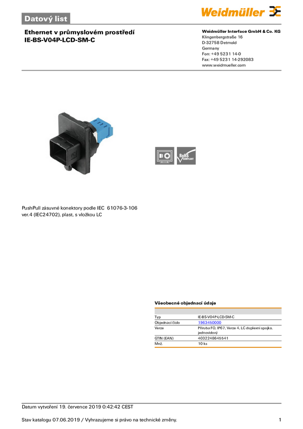 Kołnierz LWL, IP 67, wariant 4, złącze rozłączne LC Duplex, Singlemode IE-BS-V04P-LCD-SM-C Weidmüller 1963450000