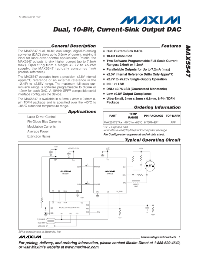 MAX5547 Dual, 10-Bit, Current-Sink Output DAC