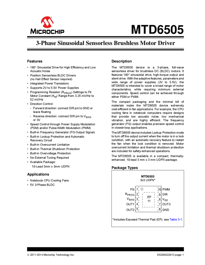 MTD6502B 5V 3-Phase BLDC Sinusoidal Sensorless Fan Motor Driver Data Sheet (05/19/2011)