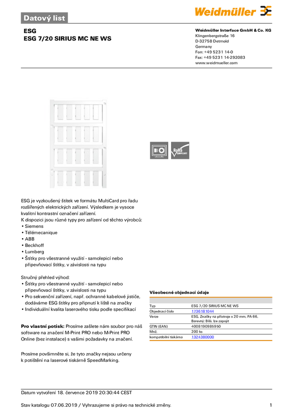 Weidmüller 1736181696 ESG 7/20 SIRIUS TK Tabliczka znamionowa Sposób montażu: zaciskanie Pole powierzchni etykietowania: