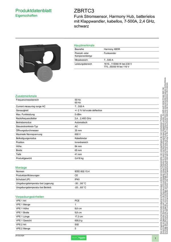 Schneider Electric Radiowy czujnik prądu, Harmony Hub, bezbateryjny ze składanym konwerterem, bezprzewodowy, 7-500A, 2,4