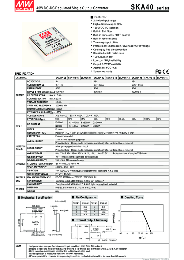 Module DC-DC 1-OUT 12V 3.33A 40W 8-PIN DIP