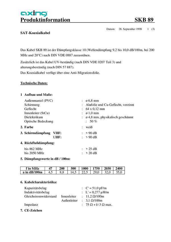 Kabel koncentryczny Axing SKB 89-03, Średnica zewnętrzna: 6.80 mm, 75 Ω, 90 dB, biały, Produkty w metrach bieżących