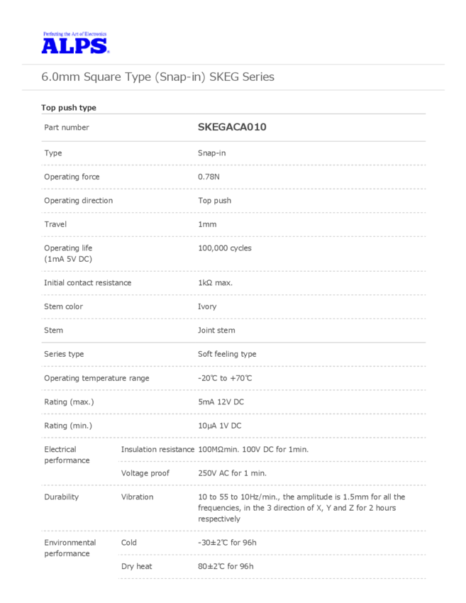Switch Tactile N.O. SPST Button PC Pins 0.005A 12VDC 0.78N Thru-Hole Bulk