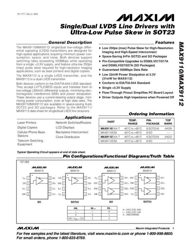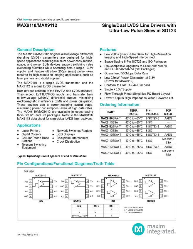 MAX9112 Dual LVDS Line Drivers with Ultra-Low Pulse Skew in SOT23