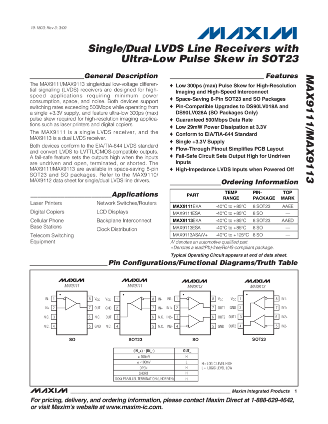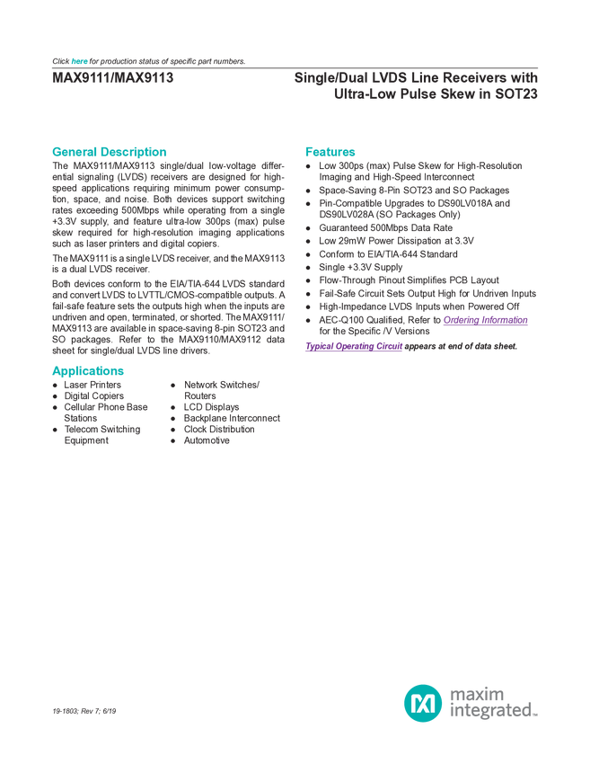 MAX9113 Dual LVDS Line Receivers with Ultra-Low Pulse Skew in SOT23