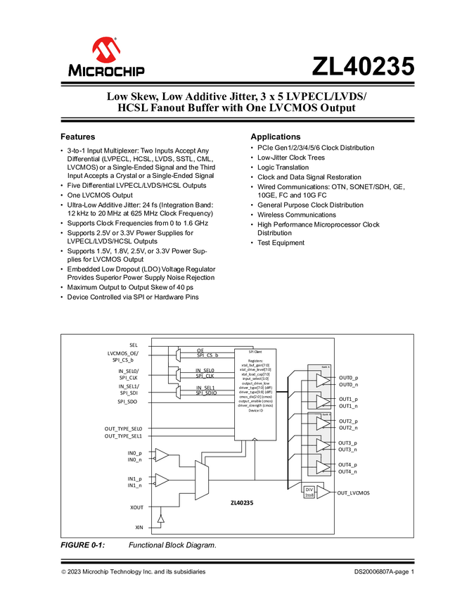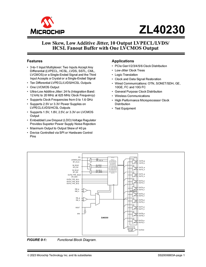 ZL40230 - Low Skew, Low Additive Jitter, 10 Output LVPECL/LVDS/HCSL Fanout Buffer with One LVCMOS Output