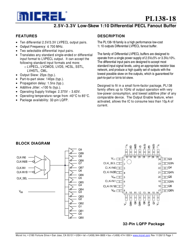 PL138-18 - 2.5V-3.3V Low-Skew 1:10 Differential PECL Fanout Buffer