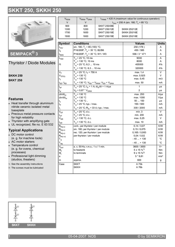 Moduł diodowo-tyrystorowy Semikron SKKT250/16E SEMIPACK R 3, 1600 V, 250 A