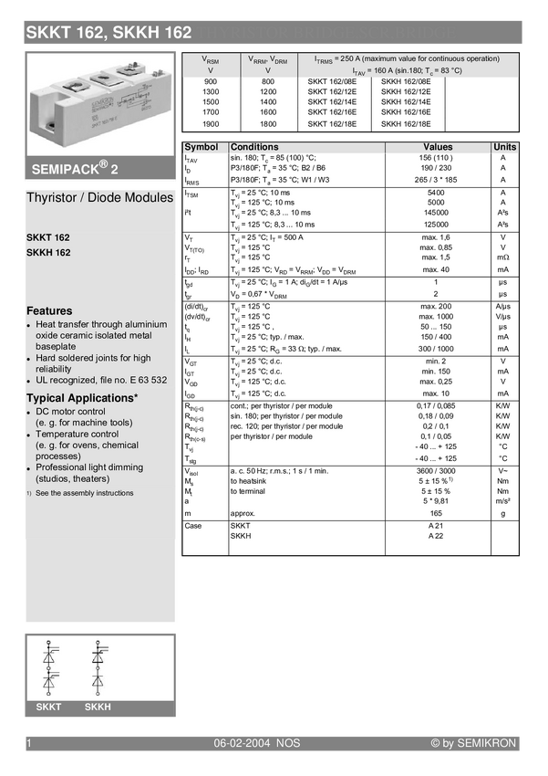 Moduł; tyrystorowy x2 szeregowy; SKKT162/16E; 160A; 1600V; SEMIPACK2; Greegoo; RoHS