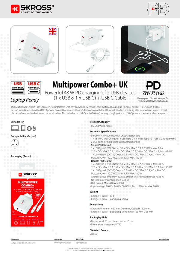 Skross Multipower Combo+ UK Ładowarka USB 48 W 1x USB-A, 1x USB-C® dom