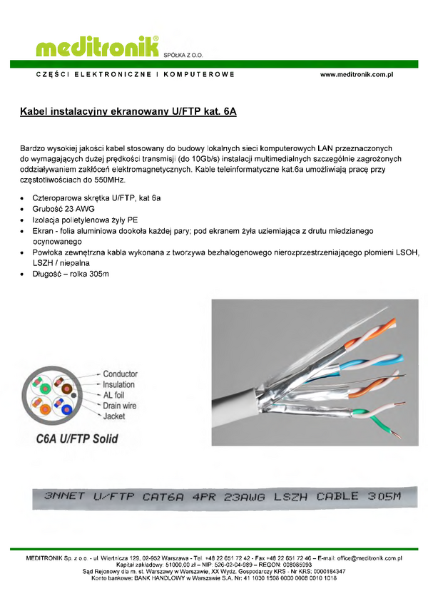 Kabel U/FTP kat. 6a PVC 4x2x23AWG skrętka 305m