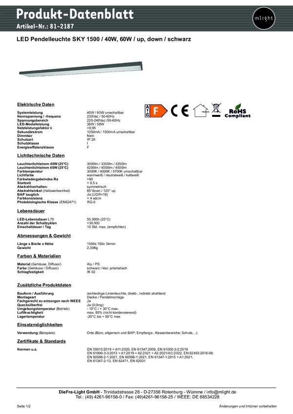 Lampa podwieszana LED mlight Pendelleuchte Sky 150cm schwarz 81-2187 40 W, 60 W czarny
