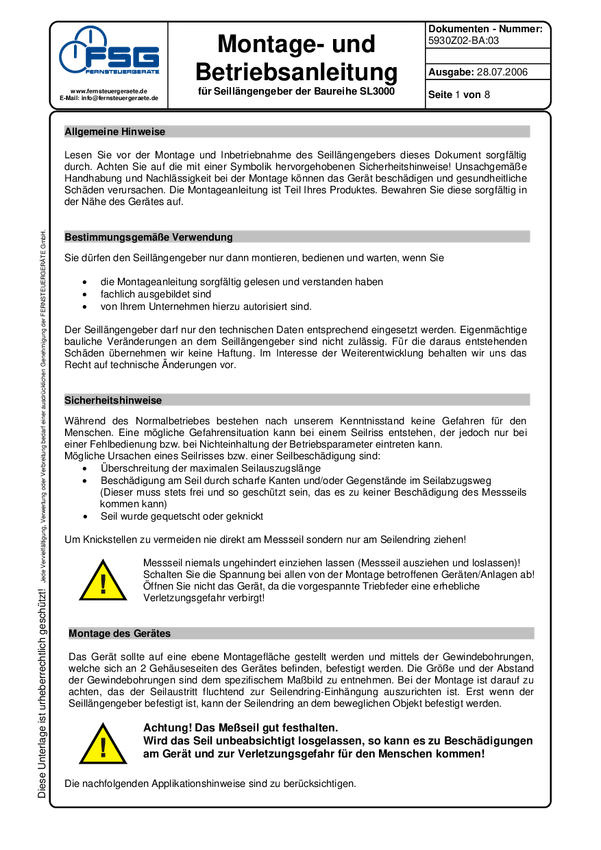 Rope Length Transmitter and Precision Signal Converter. Rope length transmitter type SL3003/XX/GS80/K/S-01 with typew approval TÜV 3 ATEX 7131 X with hart-coat with mounted wire guidance circumference of drum 200 mm Ý of measuring wire 1,35 mm 15 turns of drum correspond to 3 m wire pull-off i. e. without g Weight: 1.6kg. Manufacturers part number is 5932Z50-130.553 - SL3003/XX/GS80/K/S-01.