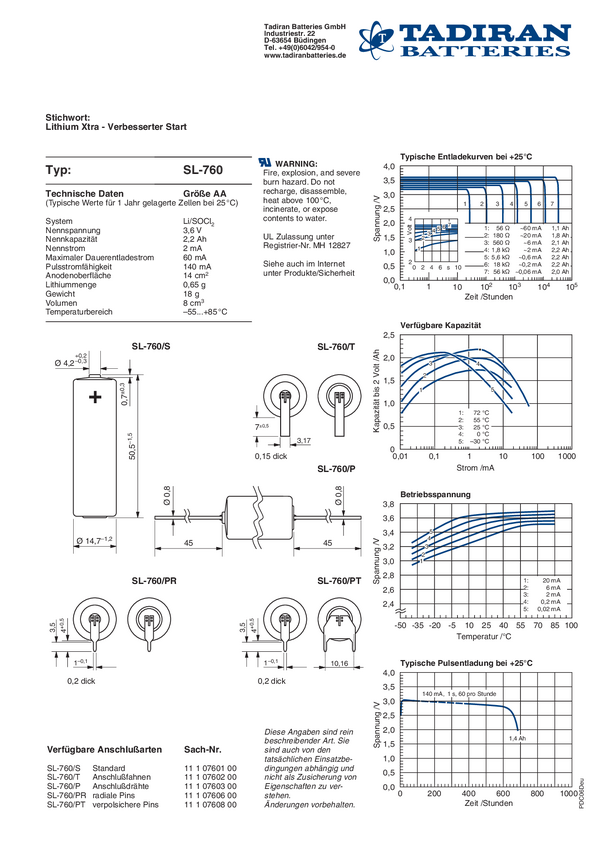 Bateria AA Tadiran Batteries SL 760 P, 3.6 V, 2200 mAh, litowe, pin lutowniczy, 1 szt.