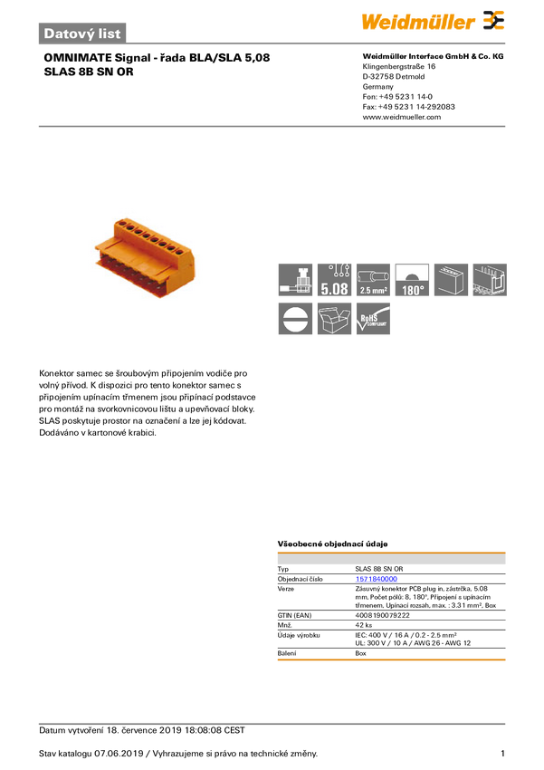 Weidmüller 1571840000 Obudowa złącza pin żeńskiego na PCB SLAS 8B SN OR, wire-to-board, piny: 8, 16 A, 42 szt.