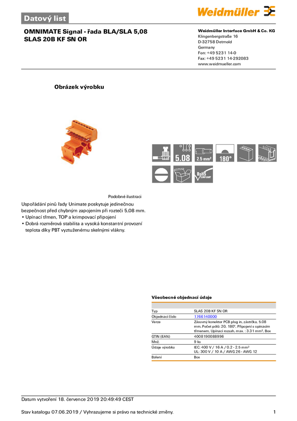 Weidmüller 1766140000 Obudowa złącza pin męskiego na PCB SLAS 20B KF SN OR, wire-to-board, piny: 20, 10 A, 9 szt.