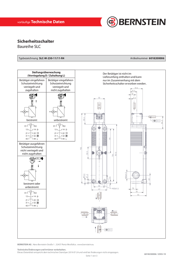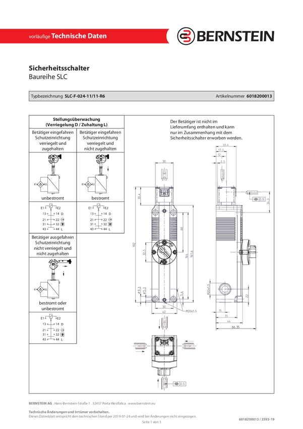 Bernstein 6018200014 SLC-F-024-20/20-R6 Wyłącznik bezpiecznikowy oddzielny siłownik zamek sprężynowy IP67 1 szt.