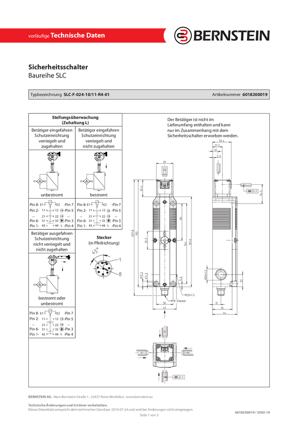 Bernstein 6018200022 SLC-F-024-10/20-R4-11 Wyłącznik bezpiecznikowy oddzielny siłownik zamek sprężynowy IP67 1 szt.