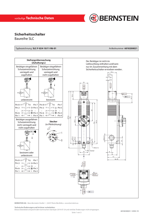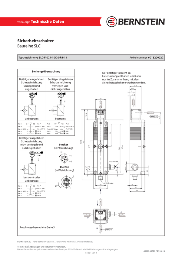 Bernstein 6018200021 Wyłącznik bezpiecznikowy SLC-F-024-10/11-R6-01, IP67, 1 szt.