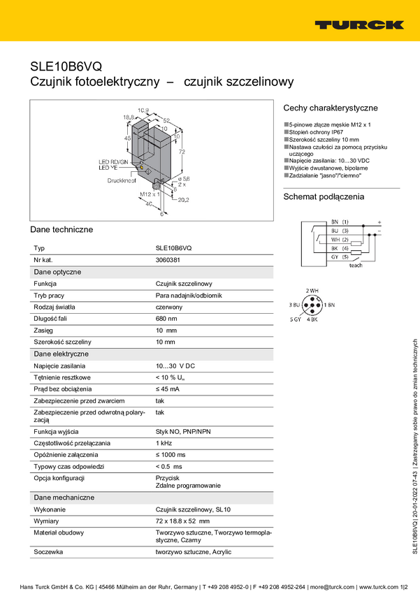 Fotokomórka Turck SLE10B6VQ 3060381 1 szt.