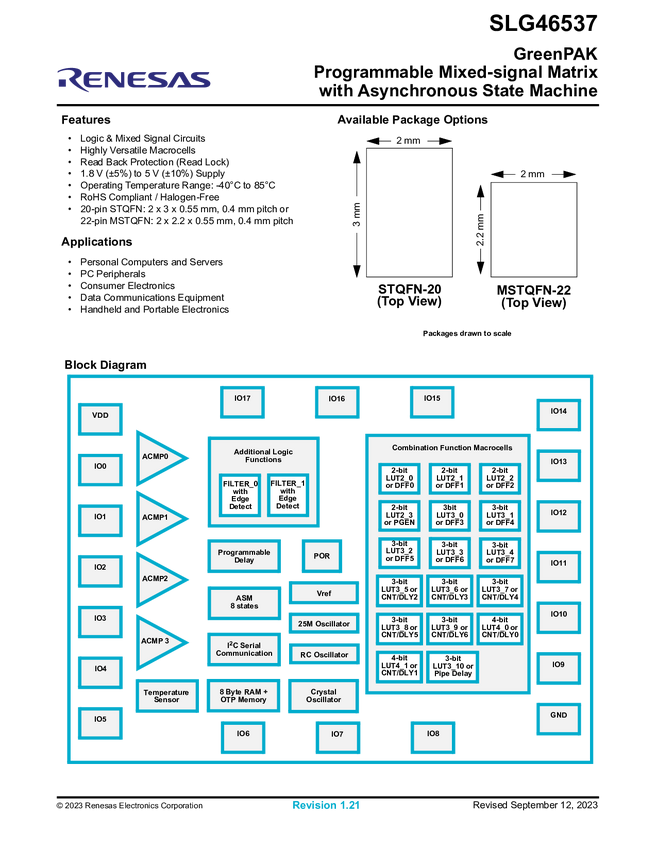 GreenPAK Programmable Mixed-Signal IC with Extended Temperature Range, VDD Range: 1.71-5.5V, 18 GPIOs, 4 ACMPs, I2C, ASM (8 States)