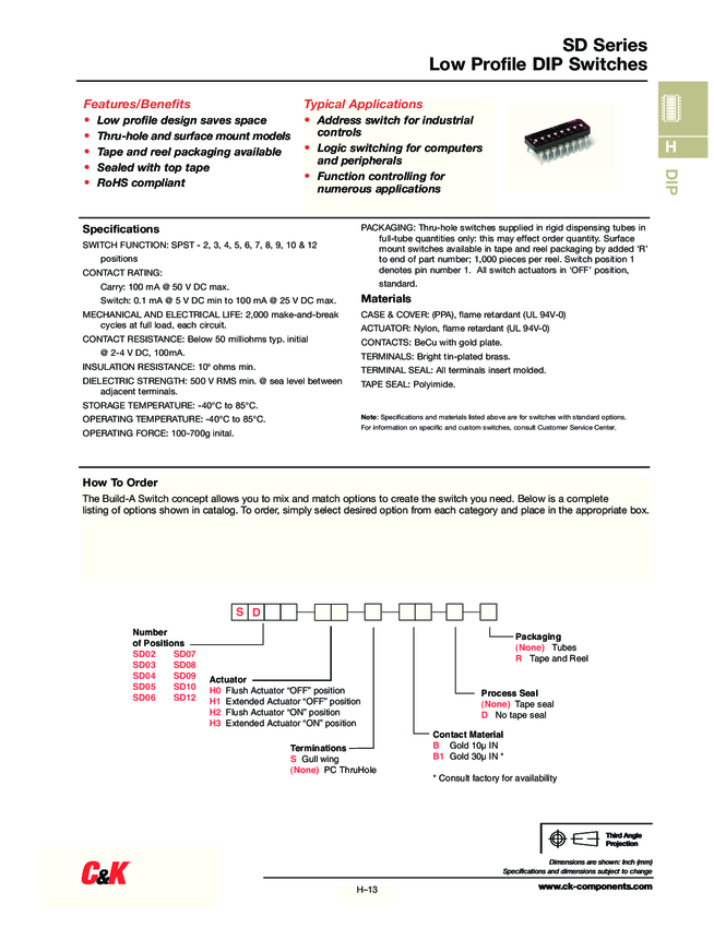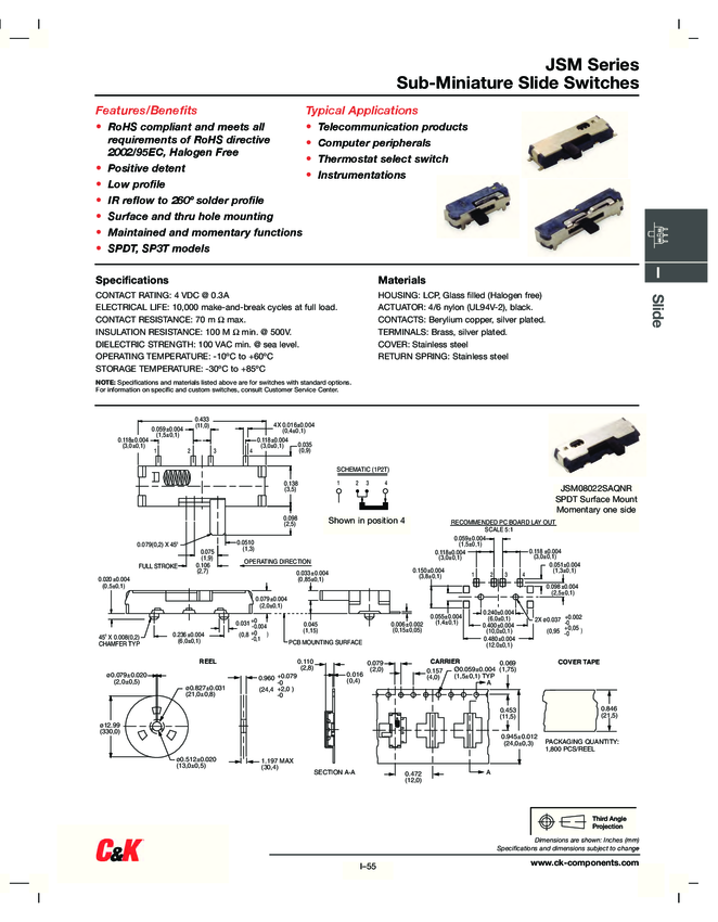 Switch Slide SP3T Side Slide 0.3A 4VDC Gull Wing SMD T/R