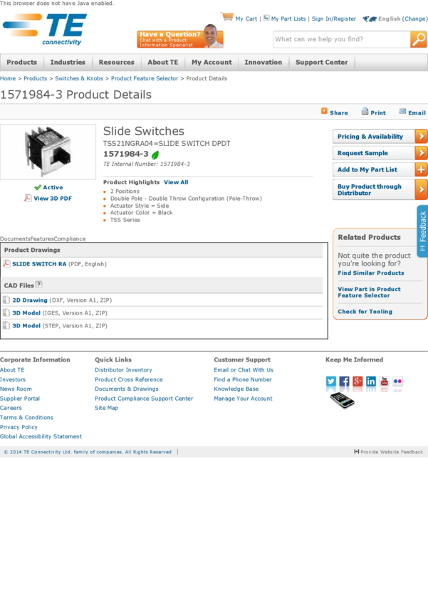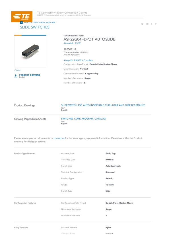Switch Slide ON None ON DPDT Side Slide 20VAC 20VDC 0.4VA PC Pins Bracket Mount/Through Hole