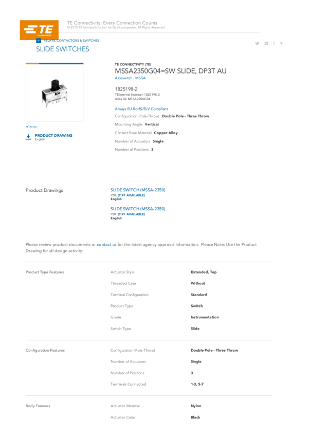 Switch Slide DPDT Extended Top Slide 0.3A 125VAC PC Pins Bracket Mount/Through Hole