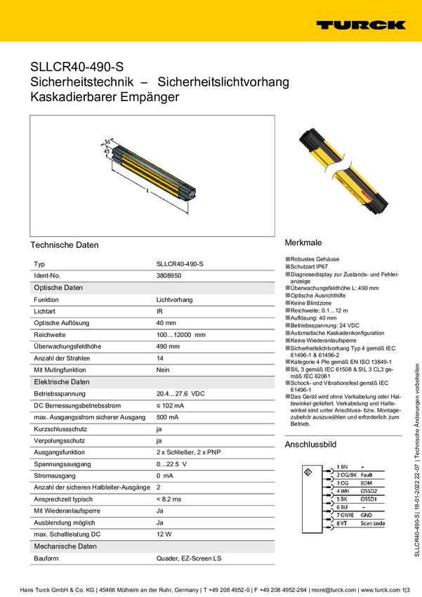 Turck Kurtyna bezpieczeństwa SLLCR40-490-S Wysokość ochronna 490 mm