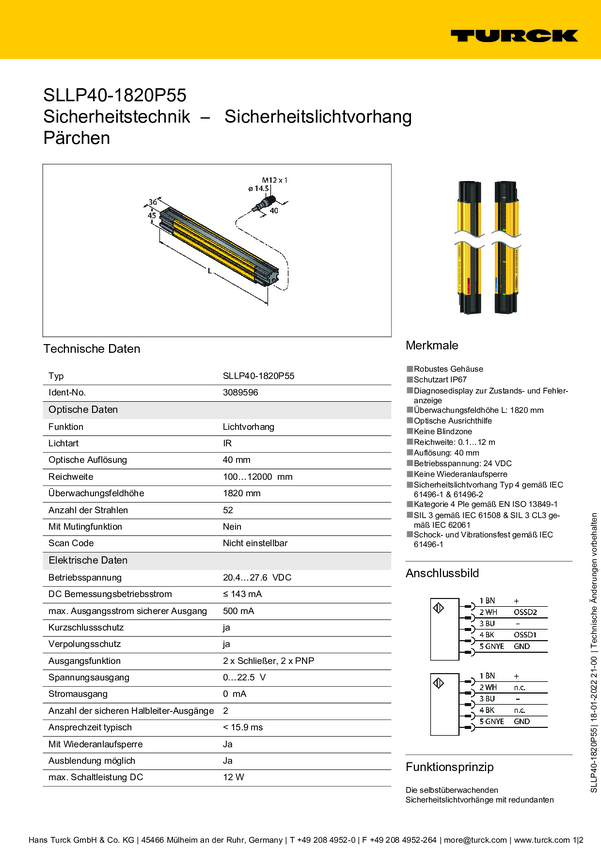 Turck Kurtyna świetlna SLLP40-1820P88 Wysokość ochronna 1820 mm