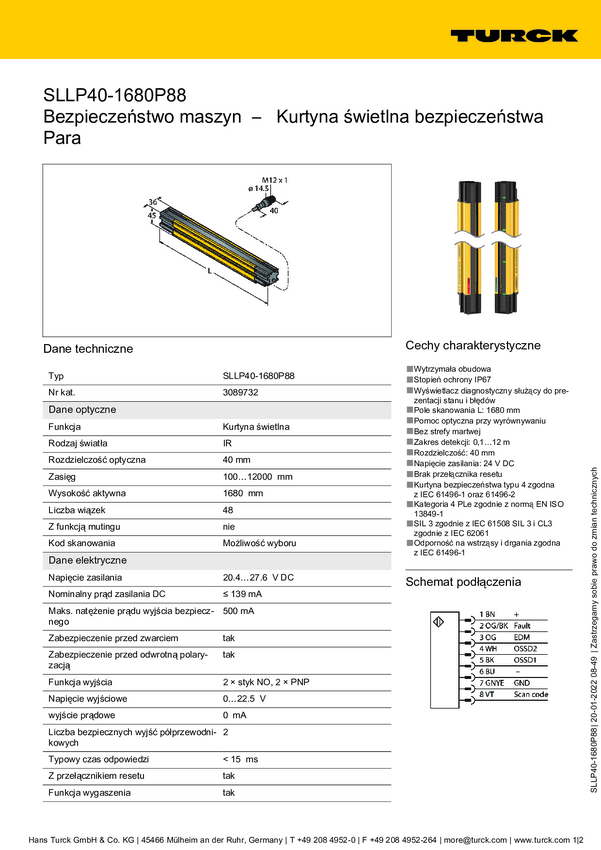 Turck Kurtyna świetlna SLLP40-1750P88 Wysokość ochronna 1750 mm