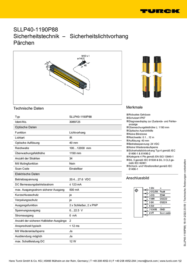 Turck Kurtyna świetlna SLLP40-1190P88 Wysokość ochronna 1190 mm