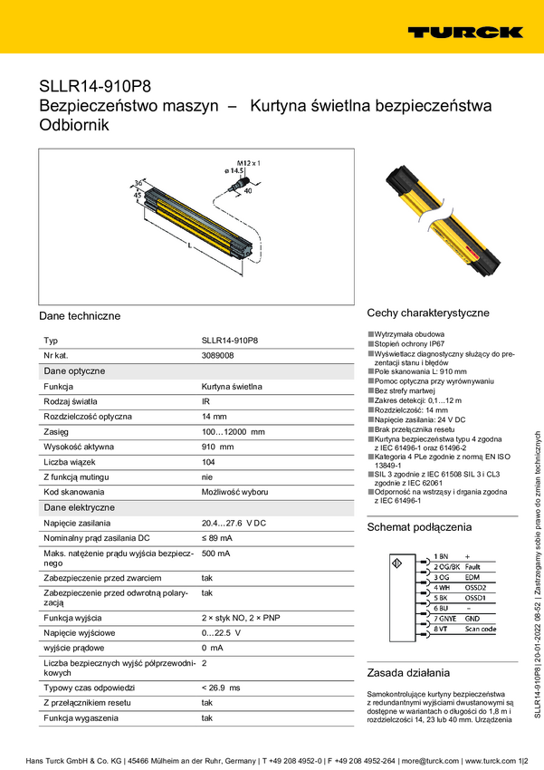 Turck Kurtyna świetlna SLLR14-910P8 Wysokość ochronna 910 mm