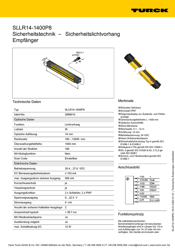 Turck Kurtyna świetlna SLLR14-1400P8 Wysokość ochronna 1400 mm