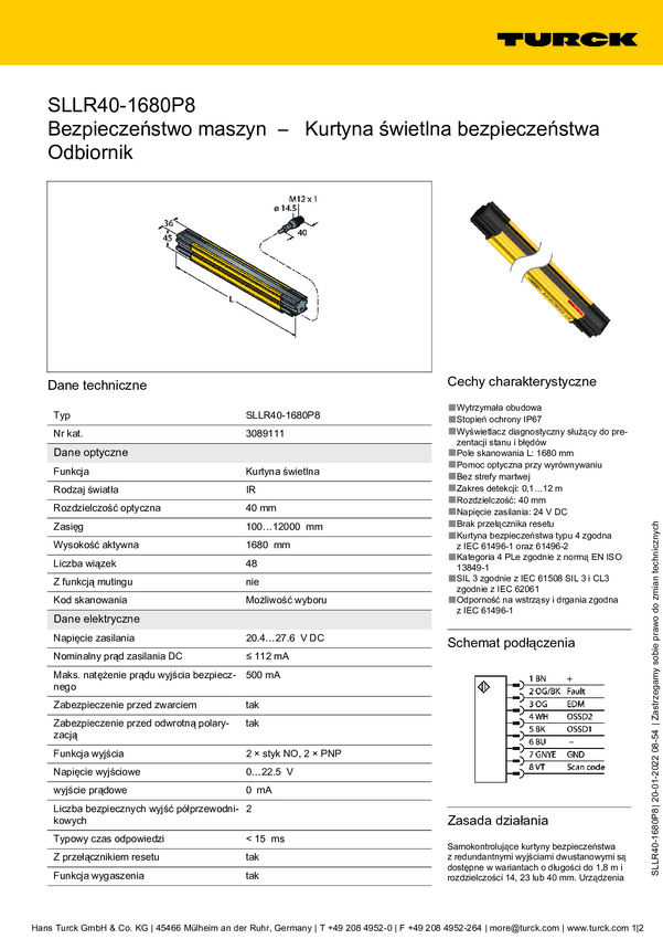 Turck Kurtyna świetlna SLLR40-490P8 Wysokość ochronna 490 mm