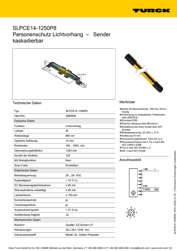 Turck Kurtyna świetlna SLPCE14-1250P8 Wysokość ochronna 1250 mm