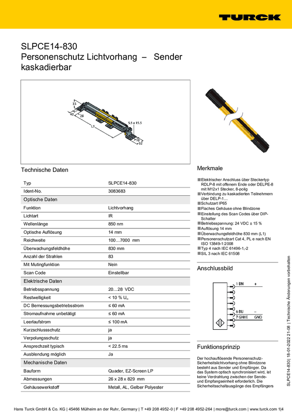 Turck Kurtyna świetlna SLPCE14-830P8 Wysokość ochronna 830 mm