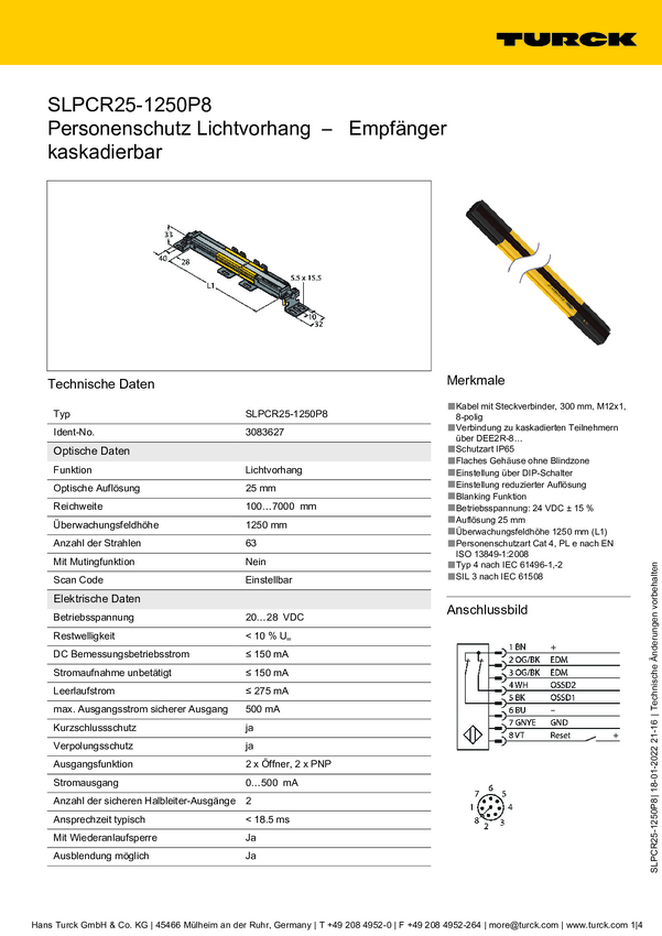 Turck Kurtyna świetlna SLPCR25-1250P8 Wysokość ochronna 1250 mm