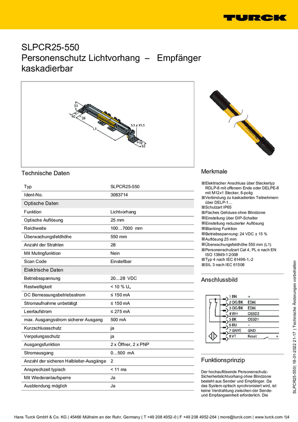 Turck Kurtyna świetlna SLPCR25-550P8 Wysokość ochronna 550 mm