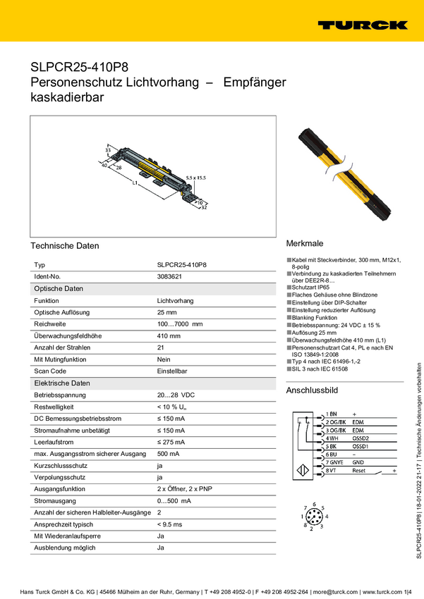 Turck Kurtyna świetlna SLPCR25-410P8 Wysokość ochronna 410 mm