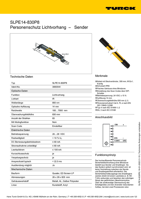 Turck Kurtyna świetlna SLPE14-830P8 Wysokość ochronna 830 mm
