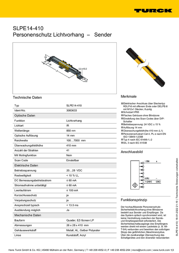 Turck Kurtyna świetlna SLPE14-410P8 Wysokość ochronna 410 mm