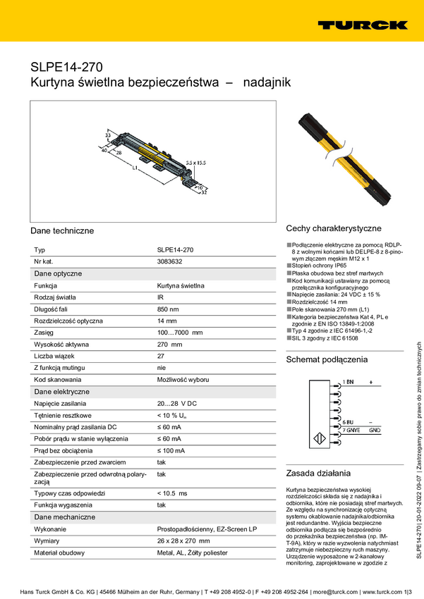 Turck Kurtyna świetlna SLPE14-270P8 Wysokość ochronna 270 mm
