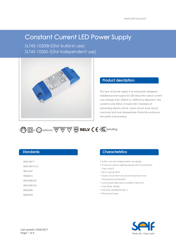 Self Electronics SLT45-1050IL-E Sterownik LED Stałonaprądowy 42 W 700 - 1050 mA 30.0 - 42.0 V/DC Możlowość stosowania w