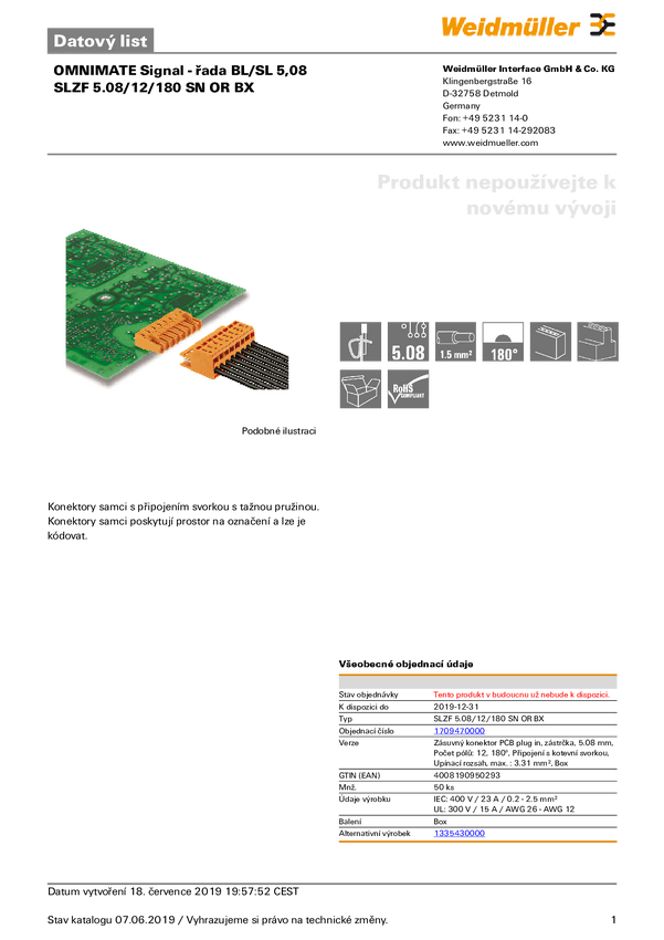 Weidmüller 1709470000 Obudowa złącza pin męskiego na PCB SLZF 5.08/12/180 SN OR BX, wire-to-board, piny: 12, 23 A, 50 sz